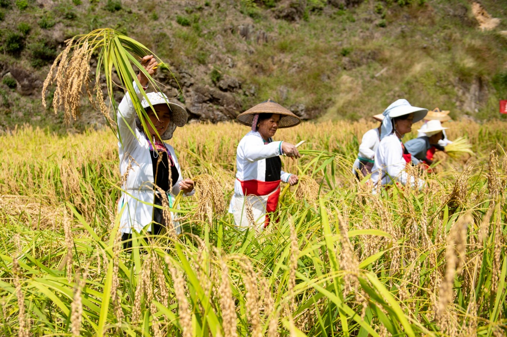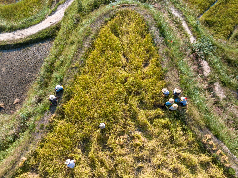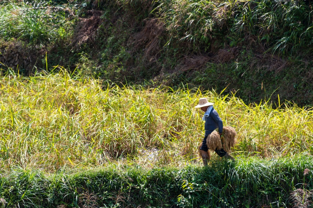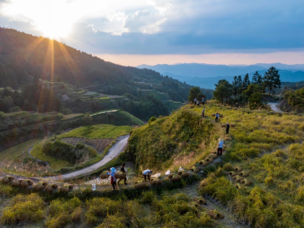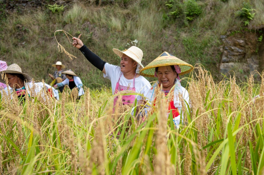 10月9日,村民在貴州省從江縣高增鄉(xiāng)建華村采收香禾糯稻谷。