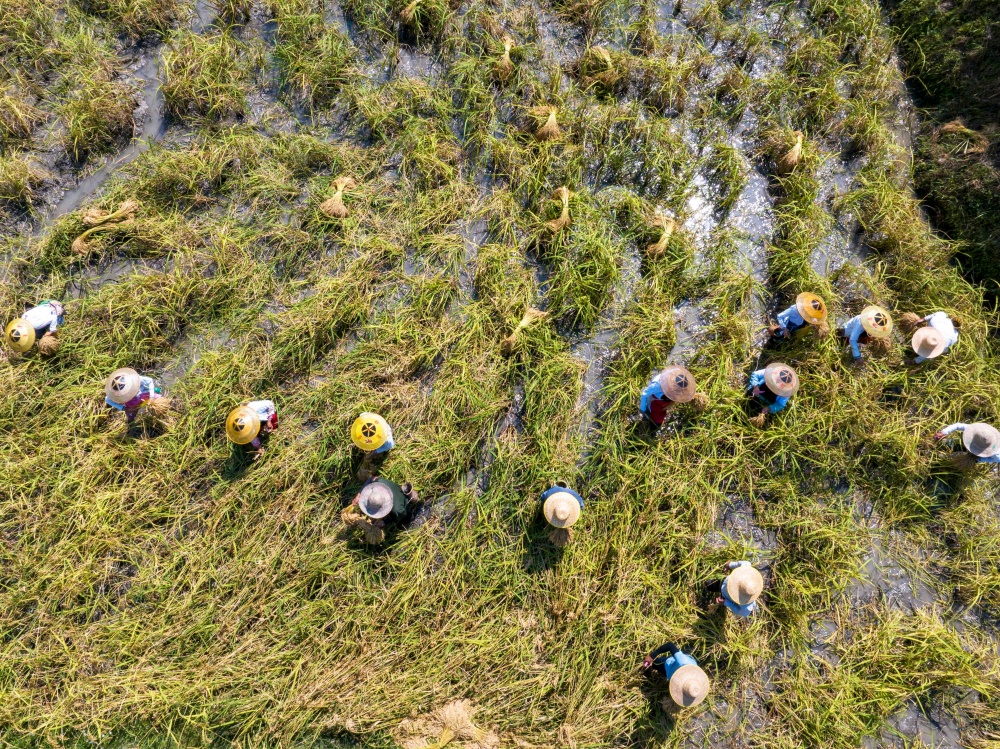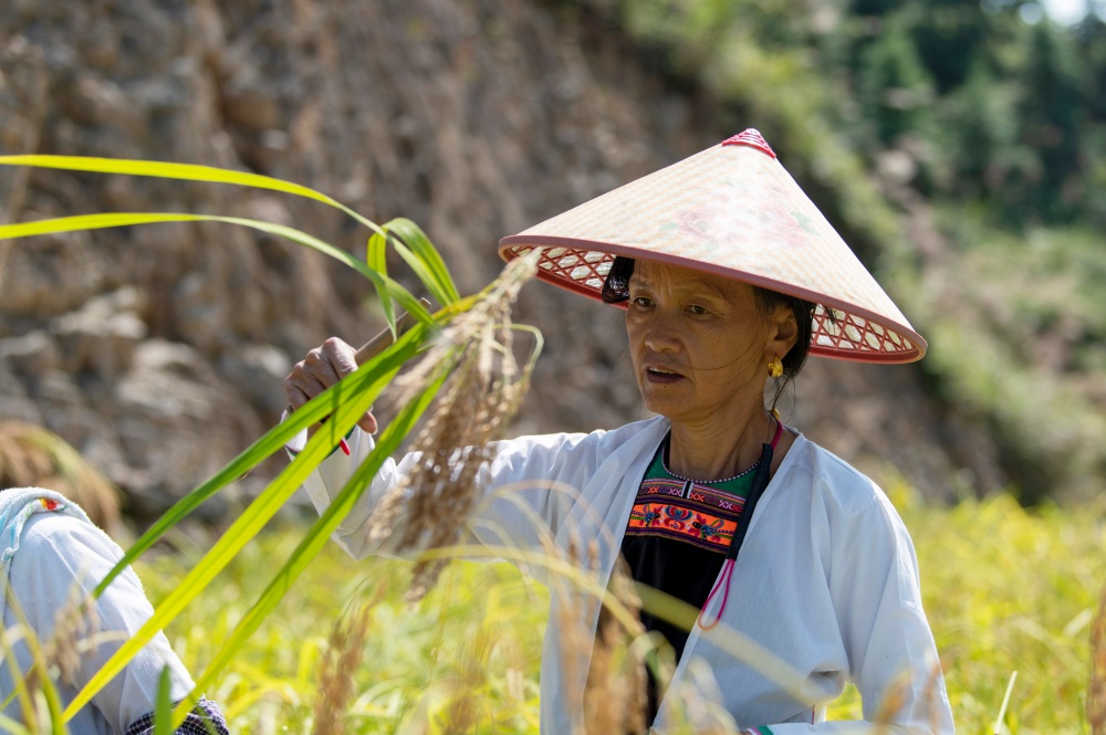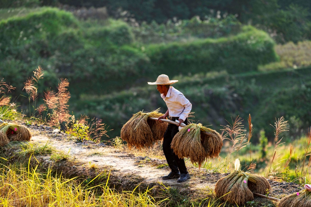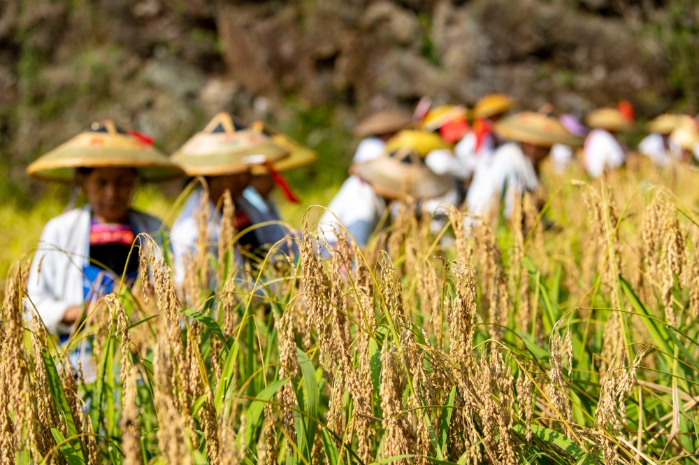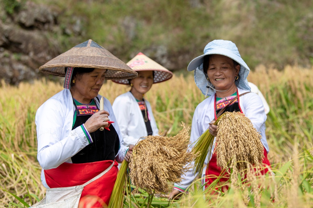 10月9日,村民在貴州省從江縣高增鄉(xiāng)建華村采收香禾糯稻谷。