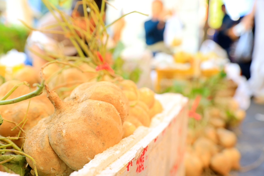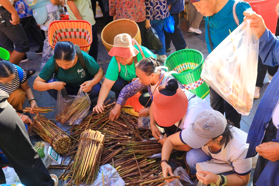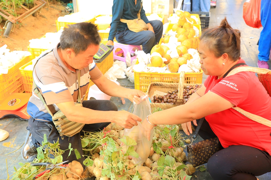 從田間剛收的嫩姜、山澗新采的板栗再到還帶著泥土氣的樅樹菌、碼放整齊的的八月筍、涼薯等等,帶著劍河秋日氣息的山物匯聚于此,成為小城里最鮮活的秋日印記。