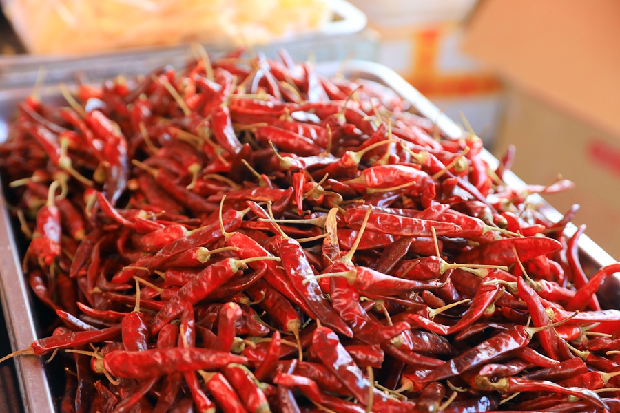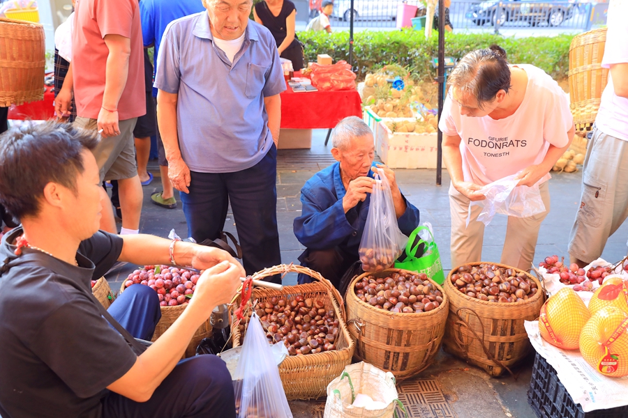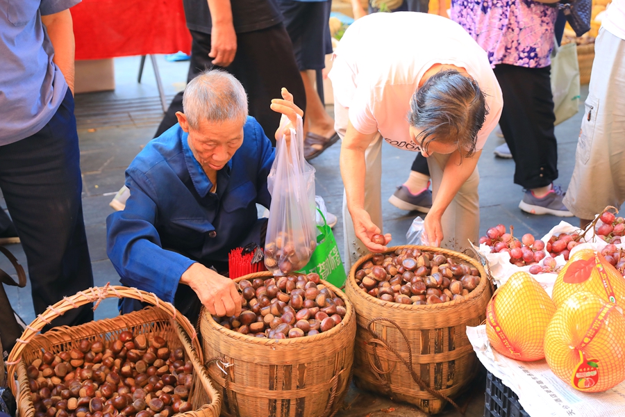 集市中段的“秋味小鋪”更顯熱鬧:攤前擺滿的板栗個(gè)個(gè)圓潤飽滿,遠(yuǎn)看像一塊褐玉,滿得讓人覺得踏實(shí);干辣椒擺滿攤位架,椒皮紅亮得泛著光,風(fēng)一吹,空氣間充滿了晃出的細(xì)碎椒香。前來選購的市民黃銀蘭手提貨物,收獲滿滿?!斑@個(gè)時(shí)間段是秋收的季節(jié),我們每年都要來市場上挑選菌子、九月黃等,又好吃又實(shí)惠。”