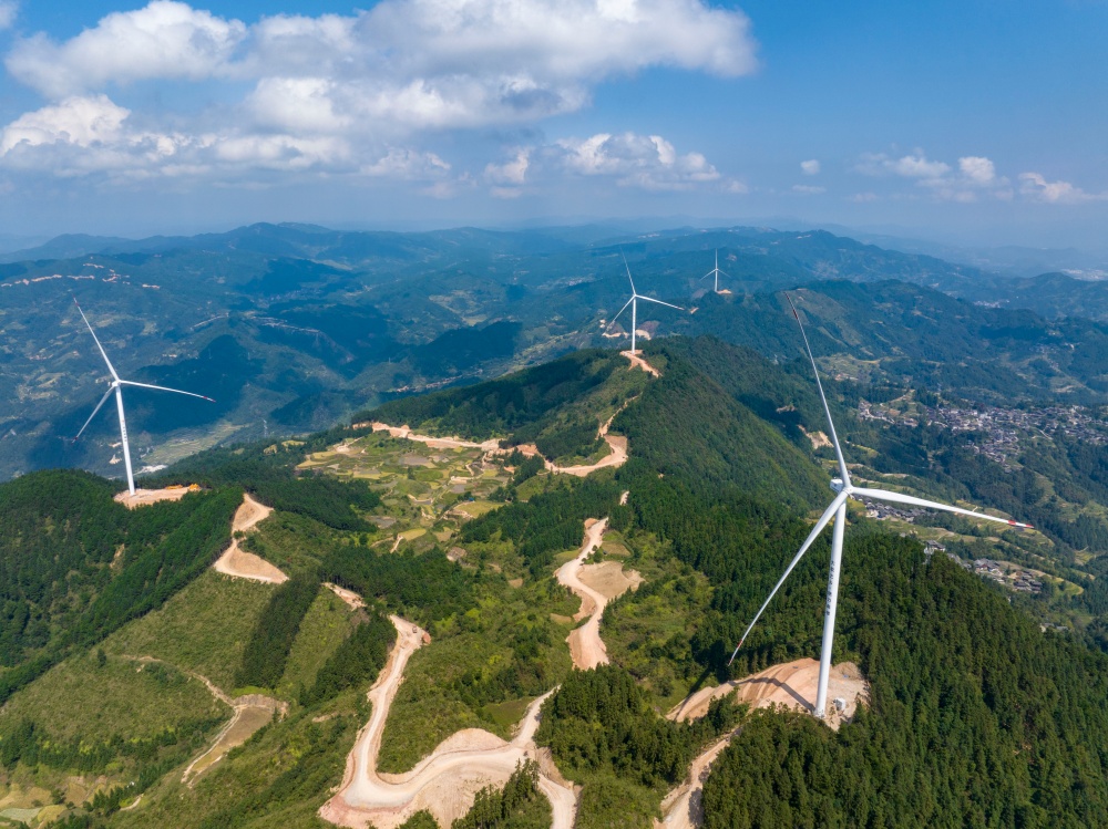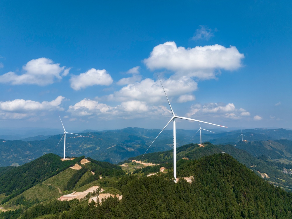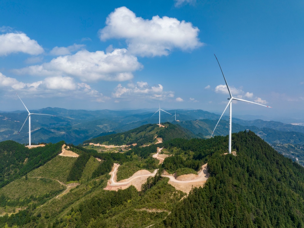 當(dāng)日,貴州省黔東南苗族侗族自治州從江縣高增鄉(xiāng)天鵝山風(fēng)電場,一臺(tái)臺(tái)風(fēng)機(jī)在湛藍(lán)的天空下有序運(yùn)轉(zhuǎn),與潔白的云朵、連綿的群山交相輝映,構(gòu)成一幅生態(tài)與科技和諧共生的壯美畫卷。
