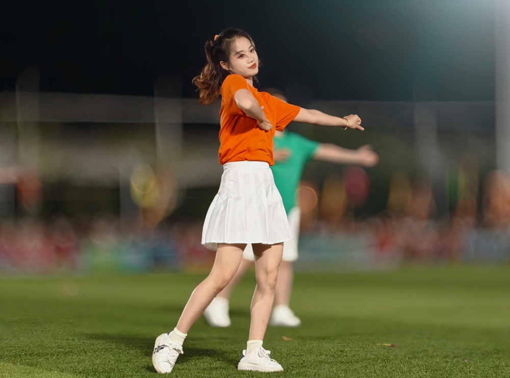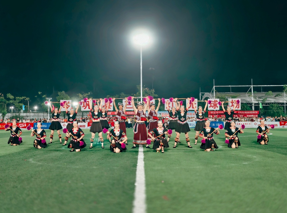 三穗縣舞蹈《一路花開》傳遞春日生機,全場大合唱《歌唱祖國》引發(fā)情感共鳴。榕江縣村超非遺藝術(shù)表演團帶來的侗族大歌《天地人間充滿愛》 尤為震撼,這支無指揮、無伴奏的多聲部合唱,以自然和聲詮釋人類非物質(zhì)文化遺產(chǎn)的魅力。岑鞏四中學子的大型足球操則將體育精神與青春活力完美融合,表演尾聲的璀璨煙花讓球場成為歡樂海洋。