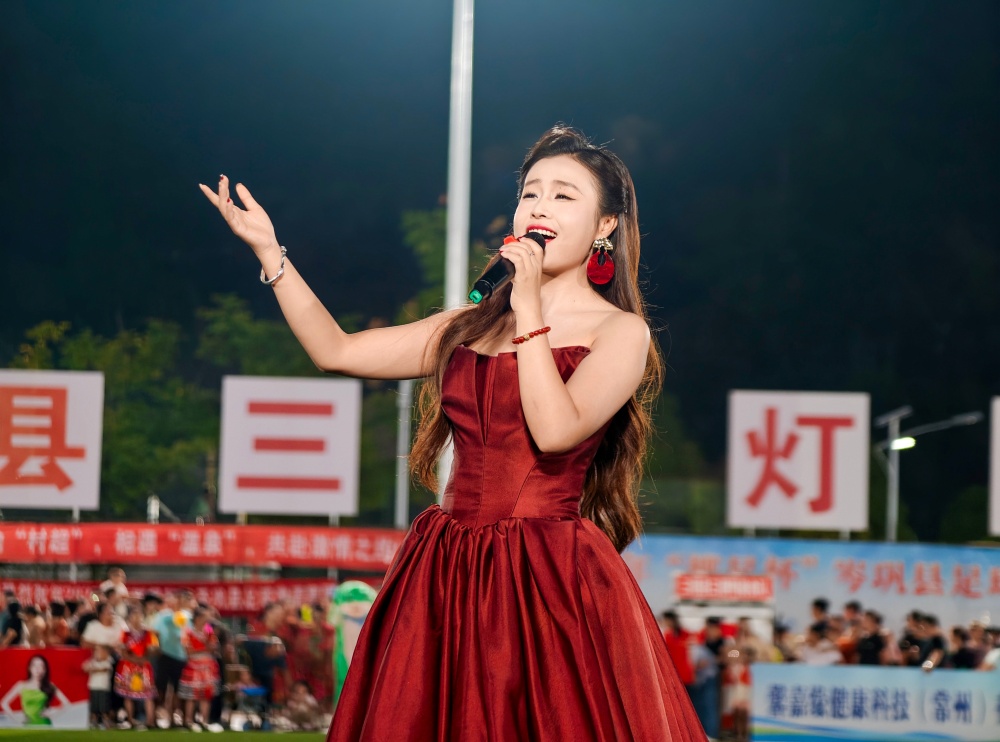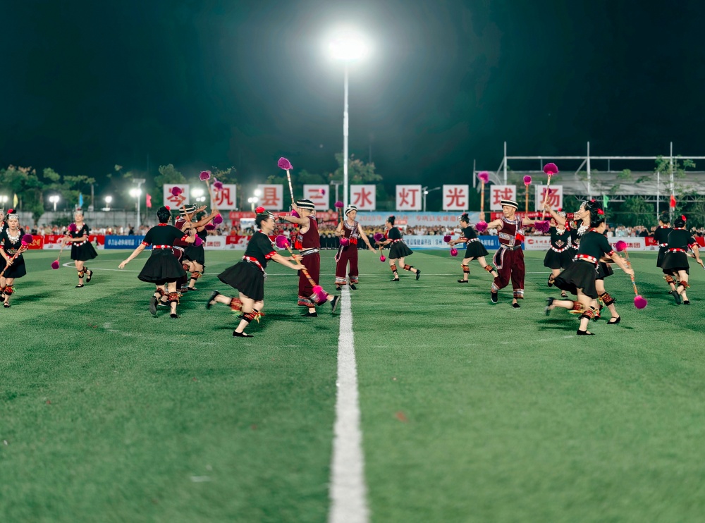 墊場賽落幕,岑鞏縣融媒體中心主持人張美超、李慧娟攜手登場,掛宣傳標語的無人機同步升空,將夜空裝點成流動的宣傳畫廊。文藝表演以省級非遺思州戰(zhàn)鼓開篇,鏗鏘鼓點搭配金錢棍與花燈扇子舞,瞬間展現(xiàn) “千年思州府” 的文化底蘊。