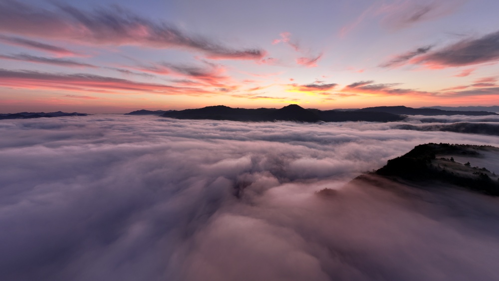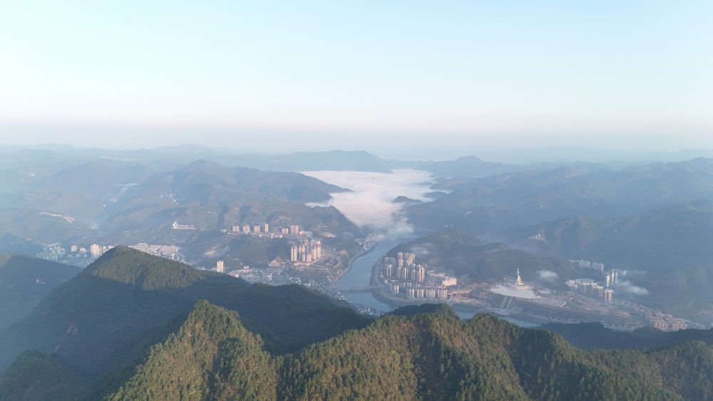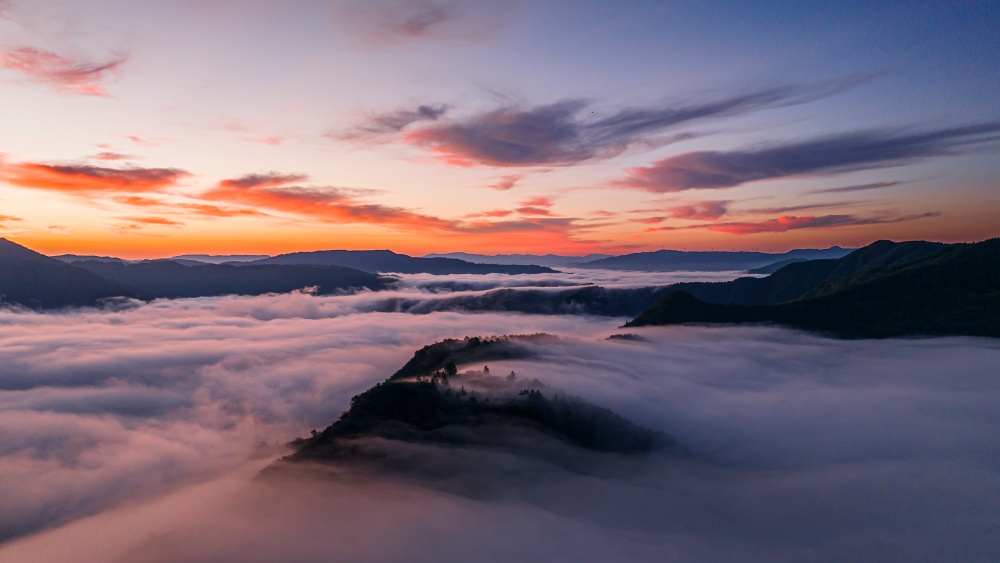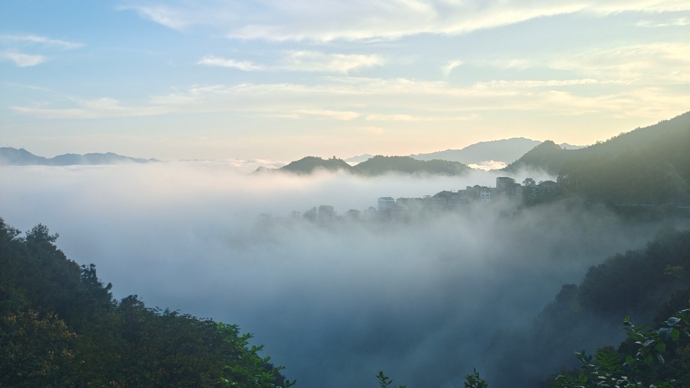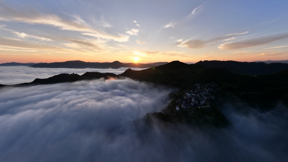 高山之巔望云海,波瀾壯闊際無邊。拂曉,朝陽透過薄霧,灑落云間,潔白無暇。綿綿云海間,山巔、房屋若隱若現(xiàn),好似人間仙境。