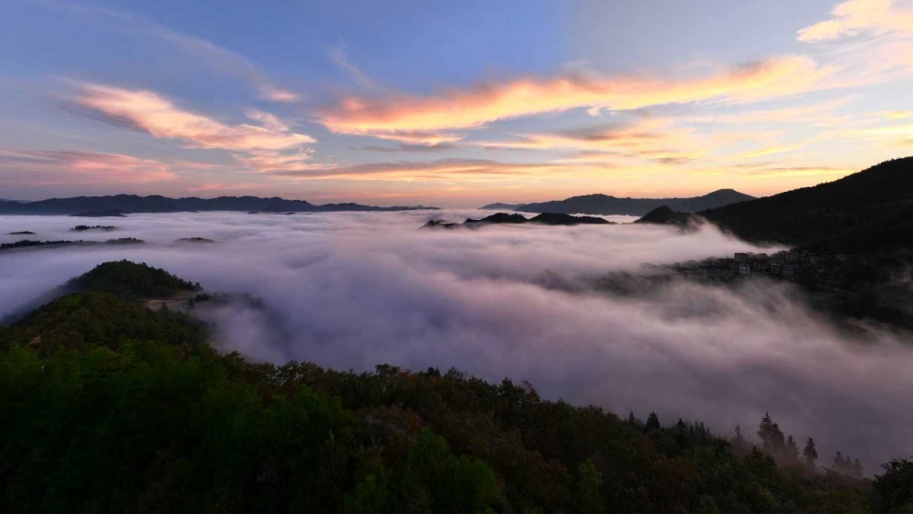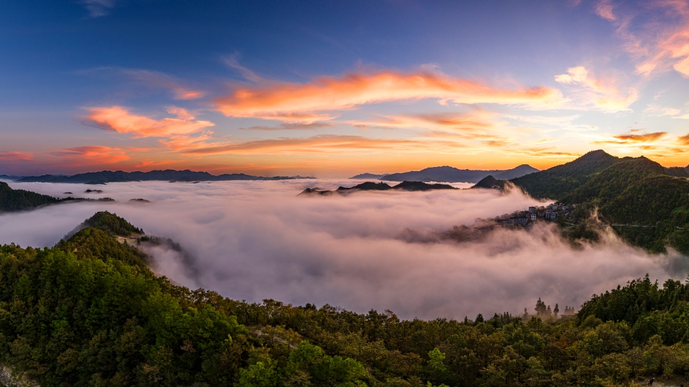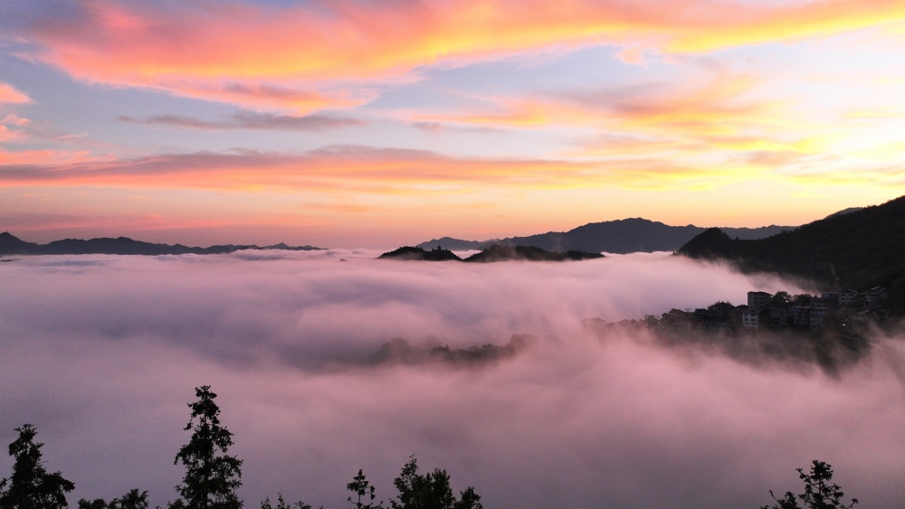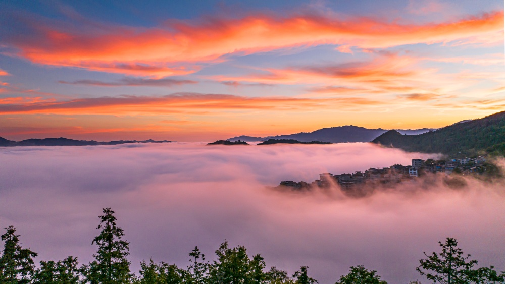 微風(fēng)襲襲,層層疊疊的云浪翻滾,猶如千軍萬馬在奔騰,增添了獨特的靈動與壯闊。隨著東方天際漸露微光,一輪紅日沖破云層,金色的霞光瞬間灑滿整片云海,翻滾的云浪仿佛被潑上了熔金,從淺橙到亮金的色彩層層遞進,耀眼卻不刺眼。云霧之下,房屋、遠山與云海、日出勾勒出一副美麗畫卷,美不勝收。