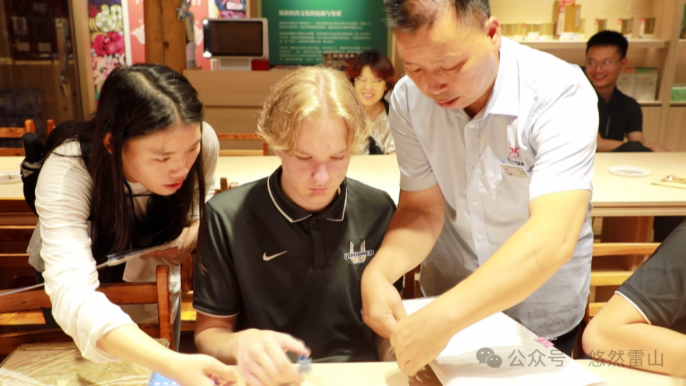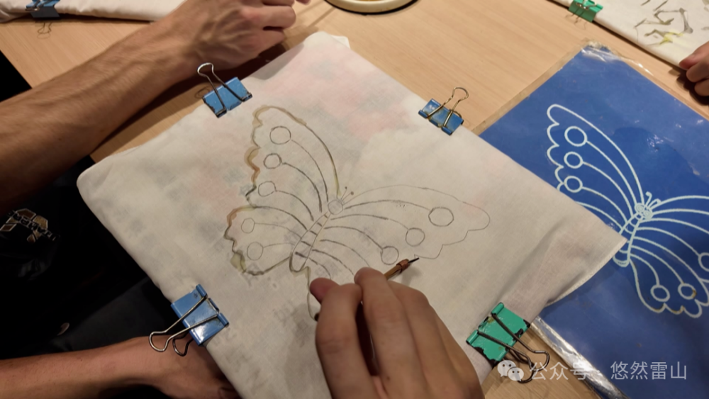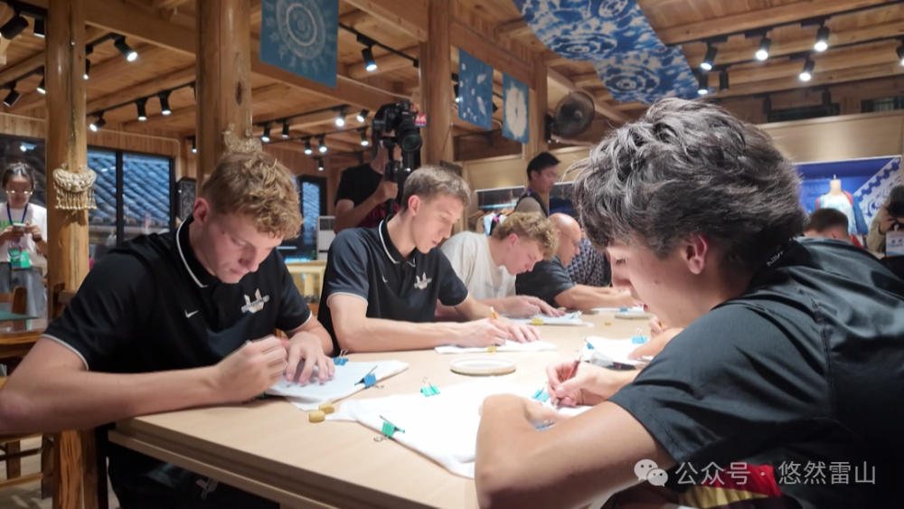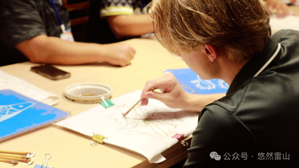 ?離開博物館,蠟染體驗成為賽前游玩的“驚喜環(huán)節(jié)”。在當(dāng)?shù)胤俏镔|(zhì)文化遺產(chǎn)代表性傳承人的指導(dǎo)下,美國青少年圍坐長桌,先尋找自己喜歡的模板圖案,用鉛筆描繪,隨后手持蠟刀蘸取蜂蠟,在白布上繪制出自己的作品。他們互相交流,在體驗中感嘆苗族的文化魅力。