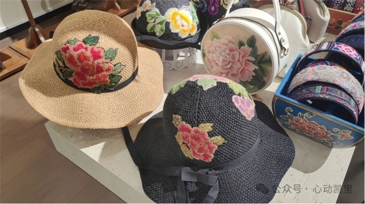 苗繡元素帽子更是集市的一大亮點(diǎn)。阿朵苗繡店家介紹,他們開(kāi)發(fā)這類帽子已有兩年時(shí)間,產(chǎn)品深受市場(chǎng)歡迎,遠(yuǎn)銷北上廣深等地。這些帽子的制作工藝復(fù)雜而精細(xì),繡娘需先在布料上繡出鳳凰或者花朵等各式精美花色與圖案,再精心剪下寓意吉祥的圖騰,最后一針一線縫制到帽子上。從大檐帽、貝雷帽到草帽,款式豐富多樣,每頂都獨(dú)具匠心,將傳統(tǒng)苗繡文化與現(xiàn)代時(shí)尚完美融合。